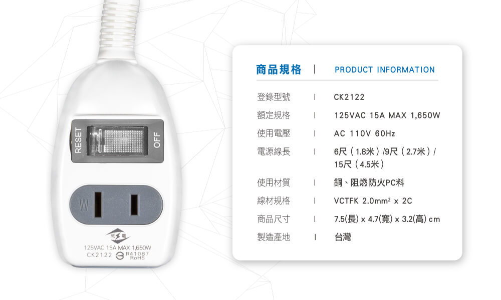 ‧ 阻燃防火PC料 ‧ 雙層被覆電源線 ‧ 過載自動...