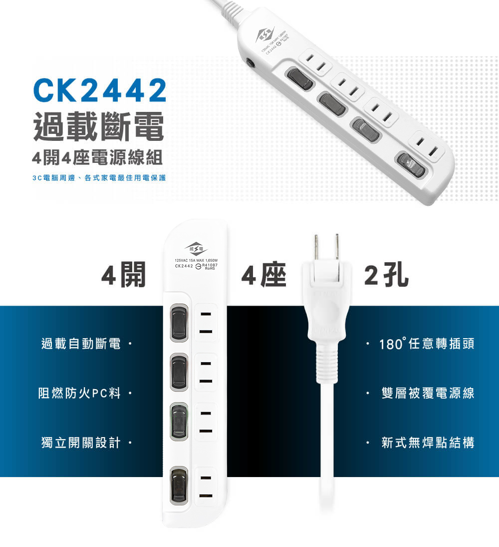 ‧ 過載自動斷電 ‧ 阻燃防火PC料 ‧ 180°任轉插...