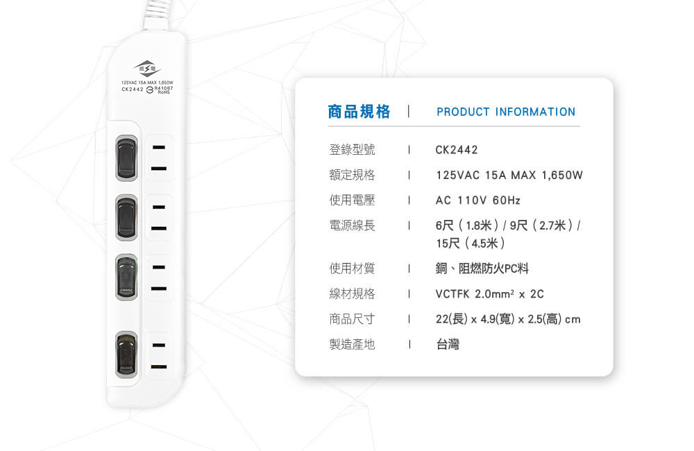 ‧ 過載自動斷電 ‧ 阻燃防火PC料 ‧ 安全防塵滑...