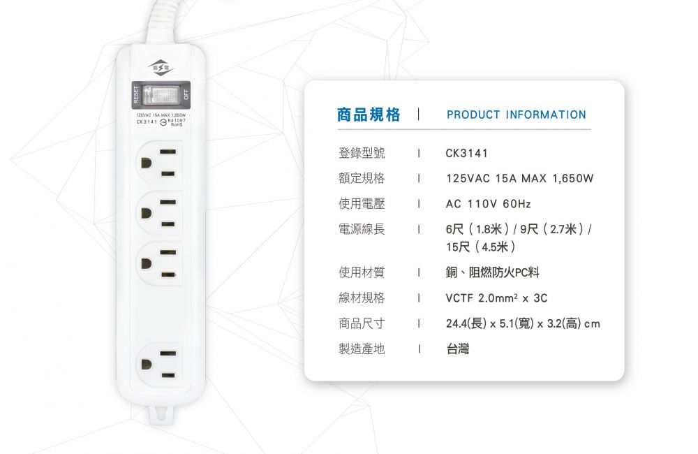 ‧ 過載自動斷電 ‧ 阻燃防火PC料 ‧ 雙層被覆電...