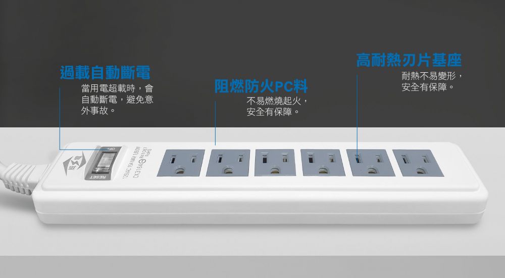 ‧ 過載自動斷電 ‧ 阻燃防火PC料 ‧ 輕鬆拔薄型...