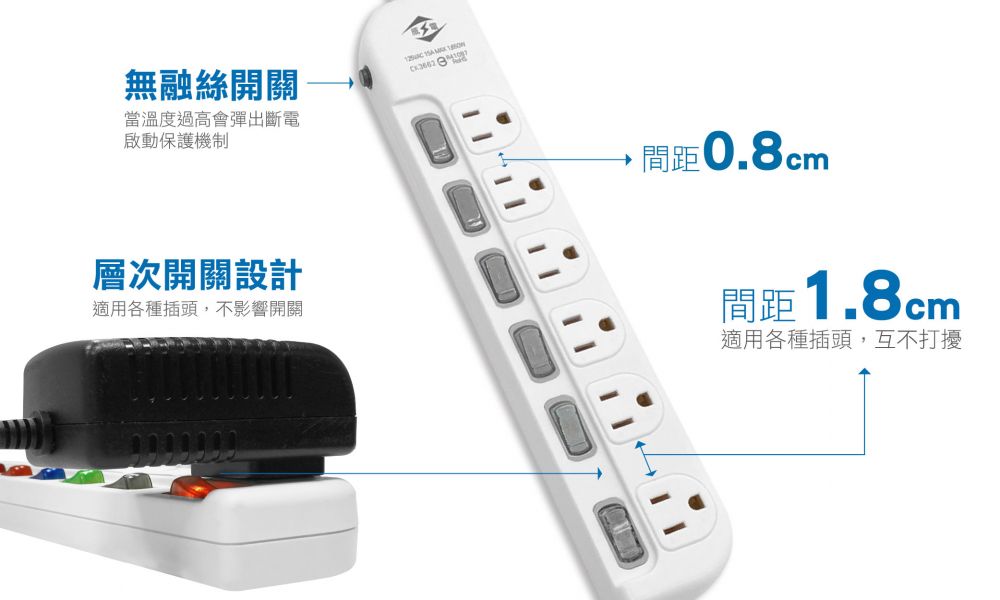 ‧ 過載自動斷電 ‧ 阻燃防火PC料 ‧ 輕鬆拔薄型...