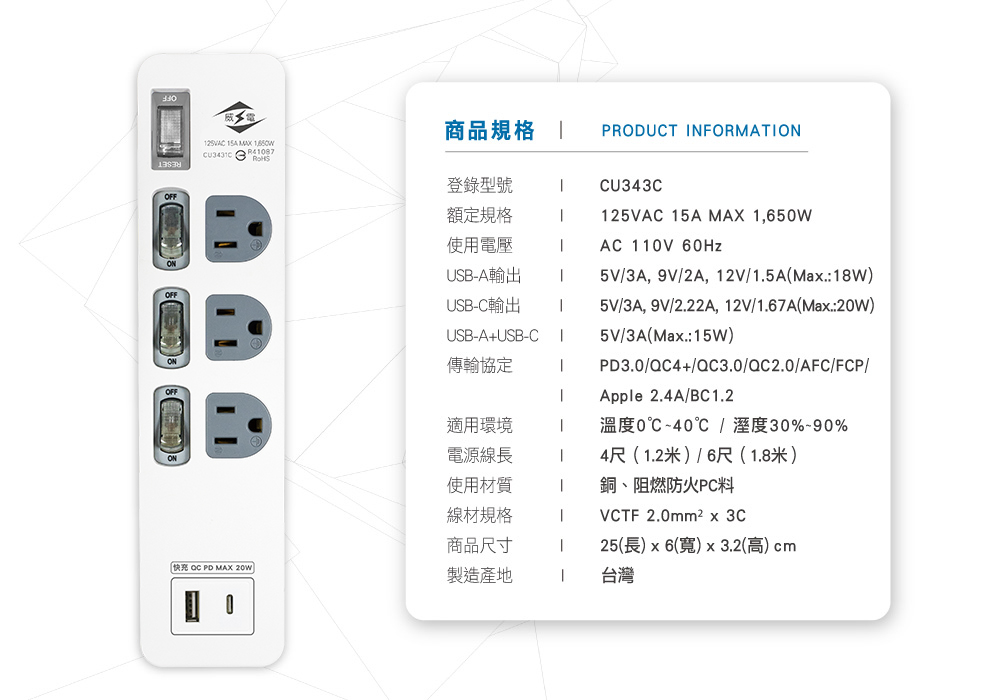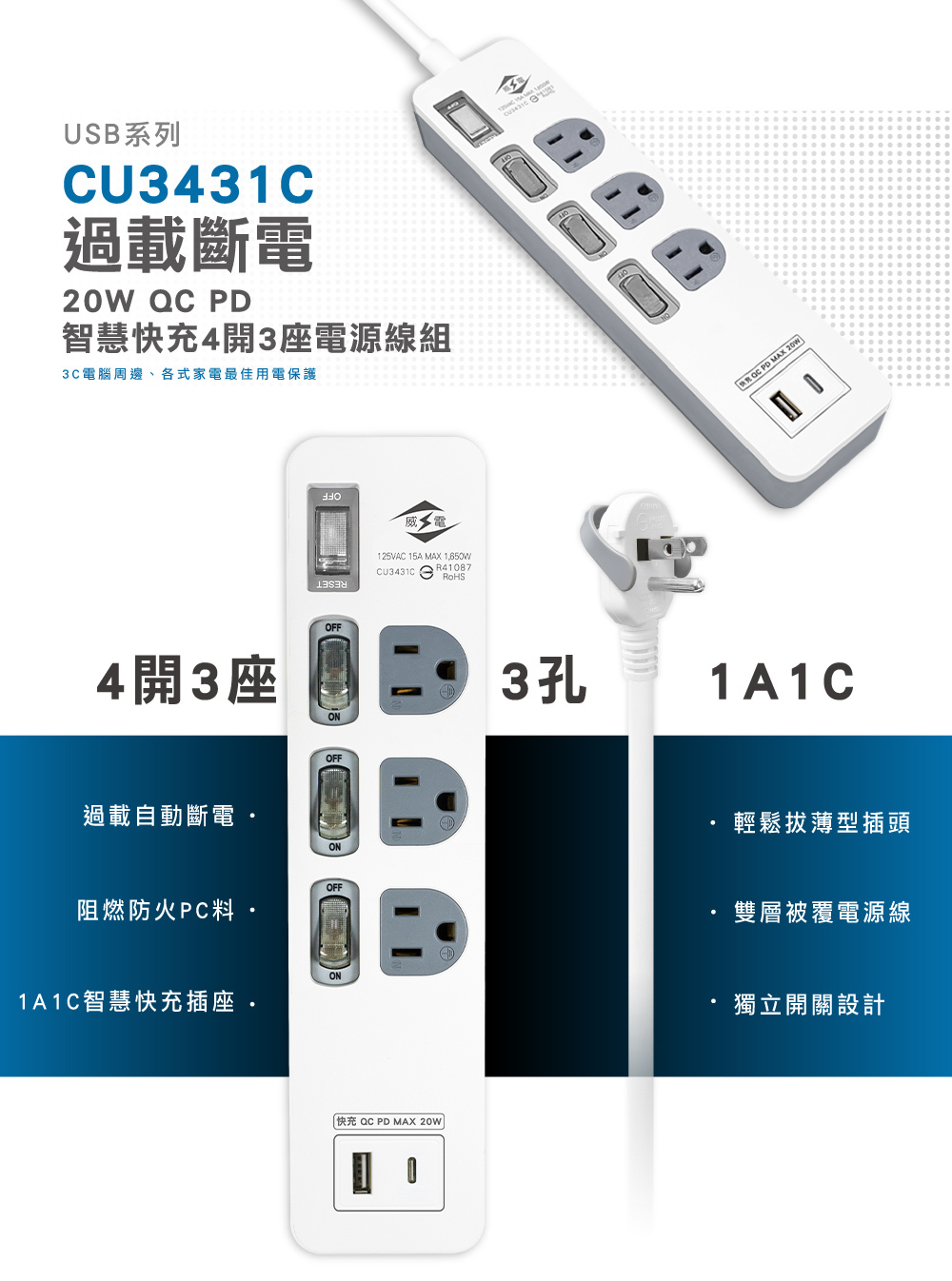20W QC PD 智慧快充4開3座電源線組 - CU3431C