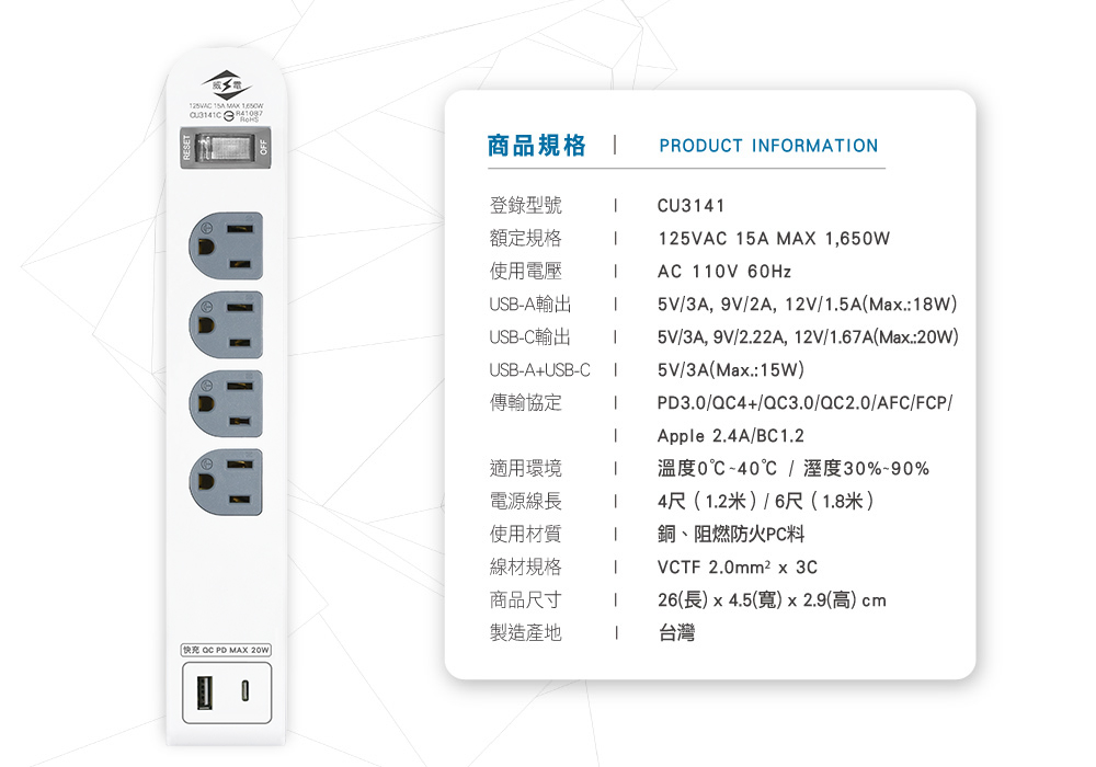 - USB輸出:5V/3A, 9V/2.22A, 12V/1.67A(Max.:20W)