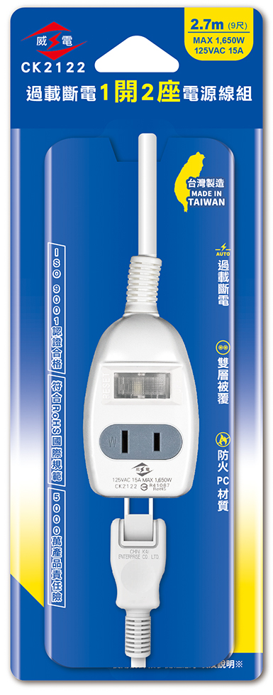 ‧ 阻燃防火PC料 ‧ 雙層被覆電源線 ‧ 過載自動...