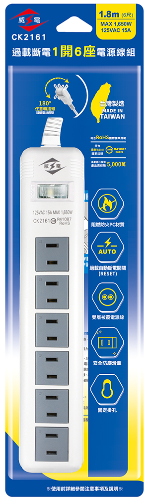 ‧ 阻燃防火PC料 ‧ 雙層被覆電源線 ‧ 過載自動...