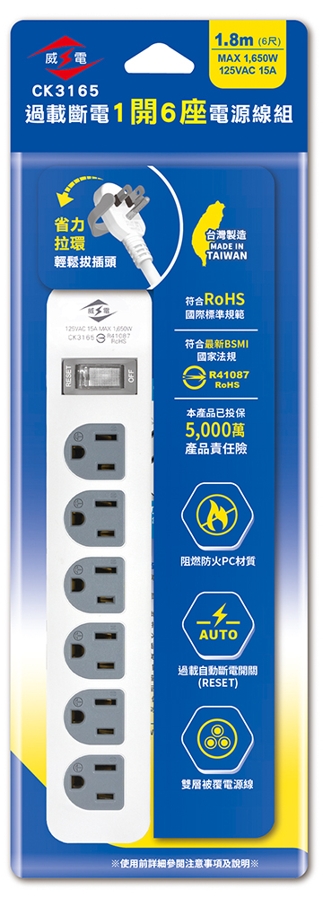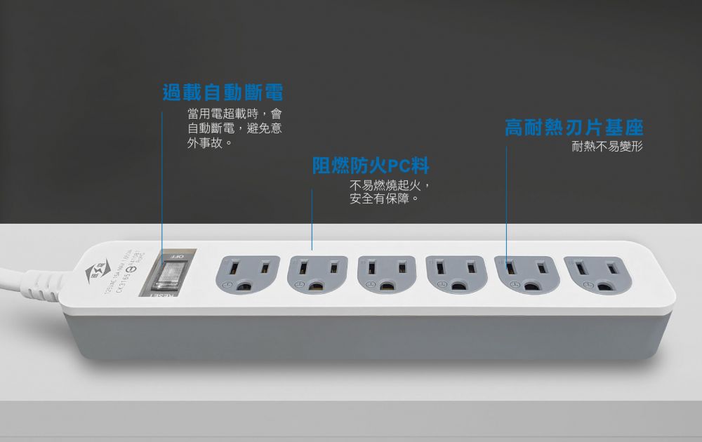‧ 過載自動斷電 ‧ 阻燃防火PC料 ‧ 輕鬆拔薄型...