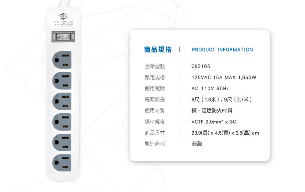 ‧ 過載自動斷電 ‧ 阻燃防火PC料 ‧ 雙層被覆電...