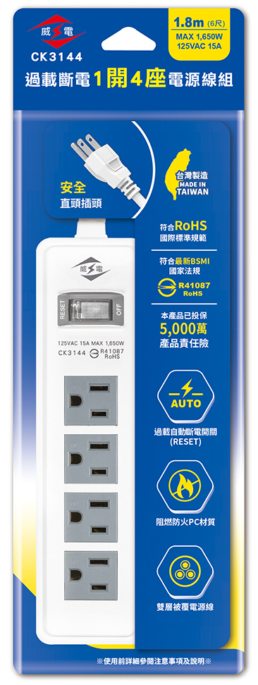 ‧ 過載自動斷電 ‧ 阻燃防火PC料 ‧ 雙層被覆電...
