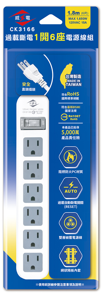 ‧ 過載自動斷電 ‧ 阻燃防火PC料 ‧ 雙層被覆電...