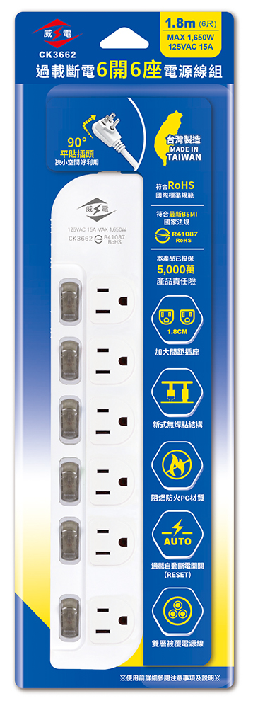 過載斷電6開6座電源延長線