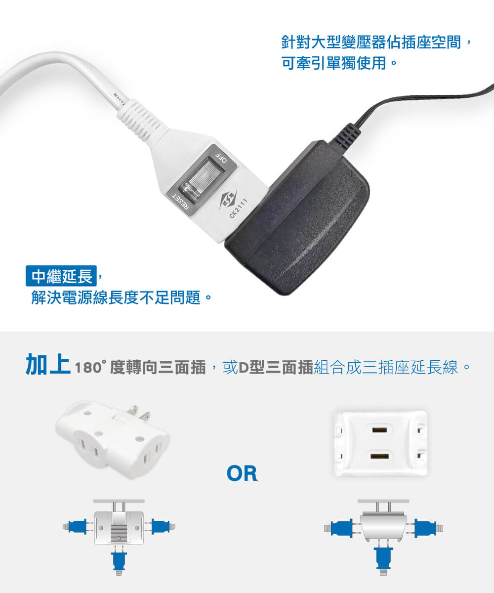 ‧ 過載自動斷電 ‧ 阻燃防火PC料 ‧ 180°任轉插...
