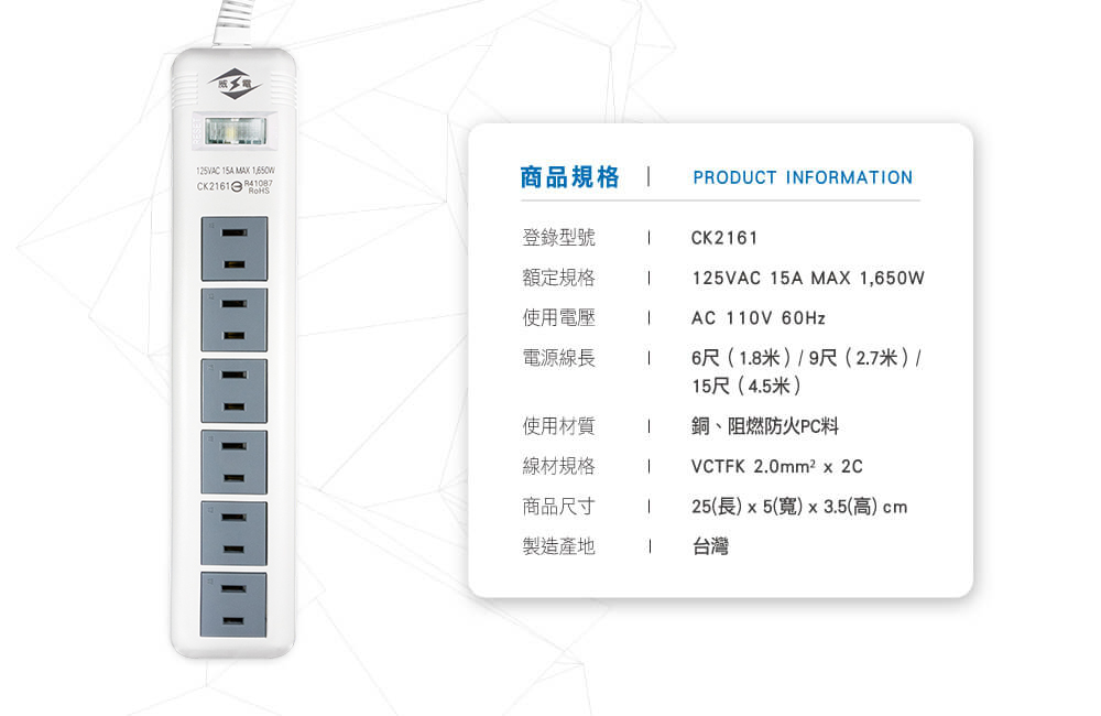 • 額定容量:125VAC 15A MAX 1,650W