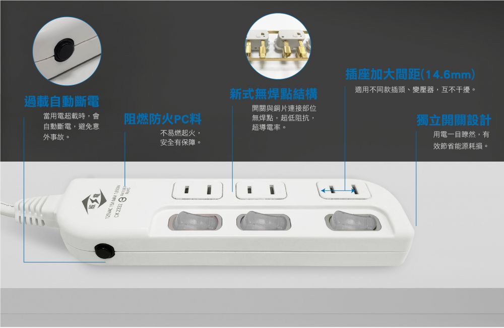 ‧ 過載自動斷電 ‧ 阻燃防火PC料 ‧ 安全防塵滑...