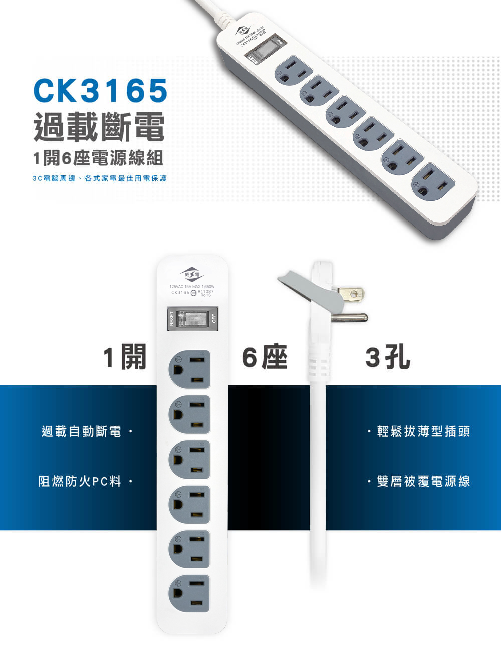 ‧ 過載自動斷電 ‧ 阻燃防火PC料 ‧ 輕鬆拔薄型...