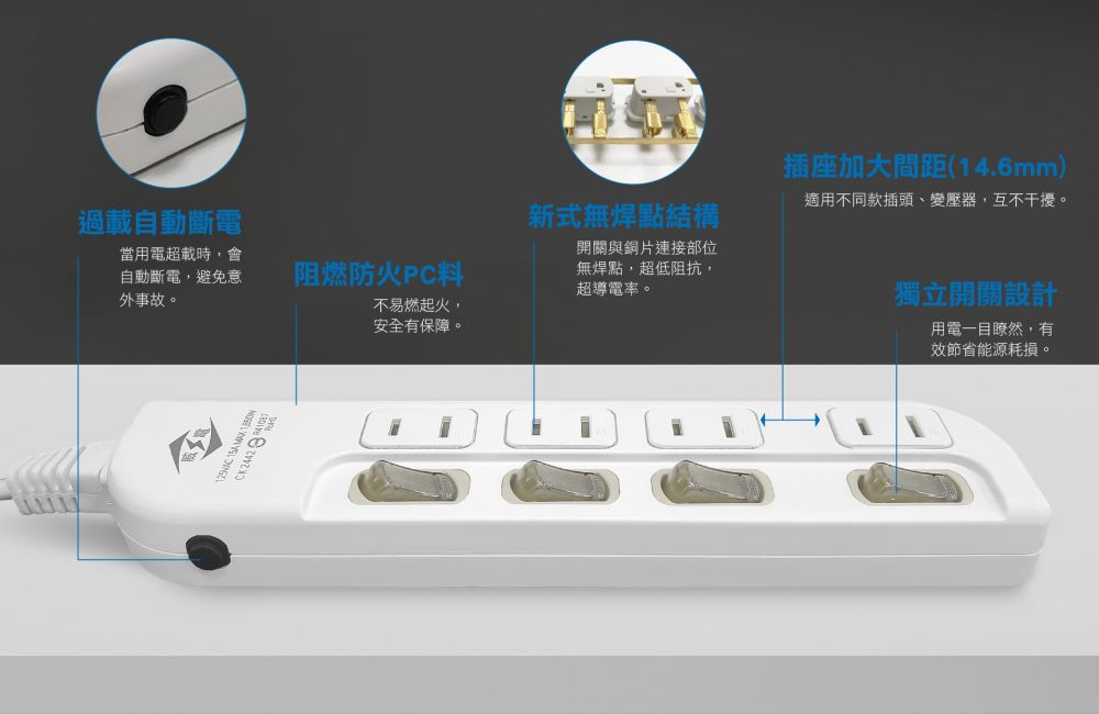 ‧ 過載自動斷電 ‧ 阻燃防火PC料 ‧ 安全防塵滑...