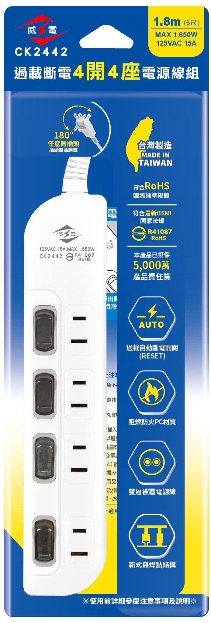 ‧ 過載自動斷電 ‧ 阻燃防火PC料 ‧ 180°任轉插...