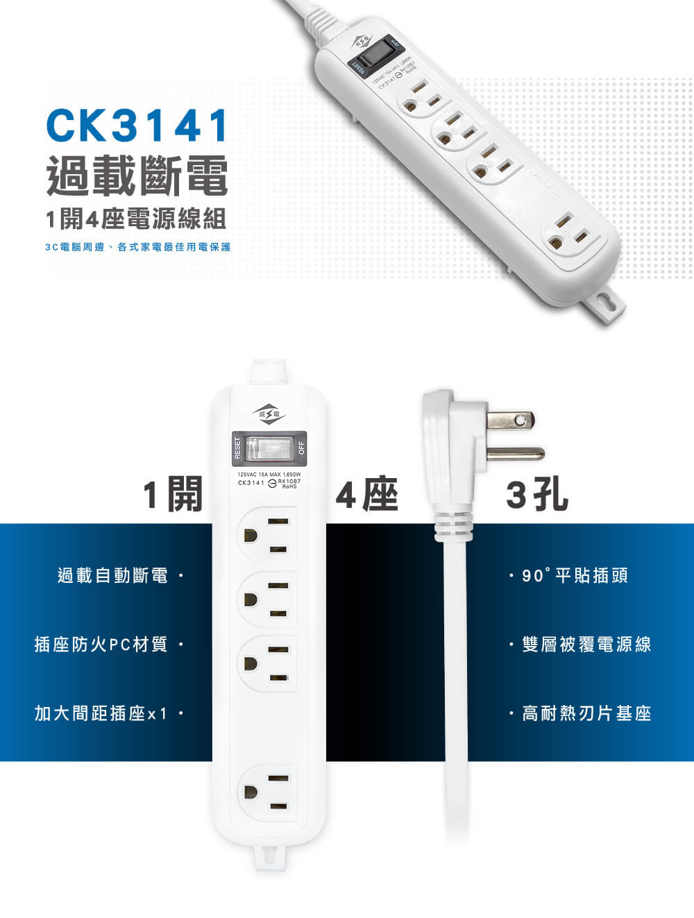 ‧ 過載自動斷電 ‧ 阻燃防火PC料 ‧ 90°平貼插...