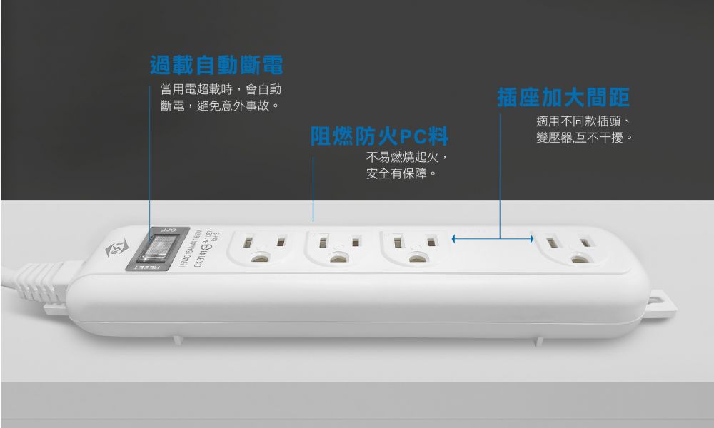 ‧ 過載自動斷電 ‧ 阻燃防火PC料 ‧ 輕鬆拔薄型...