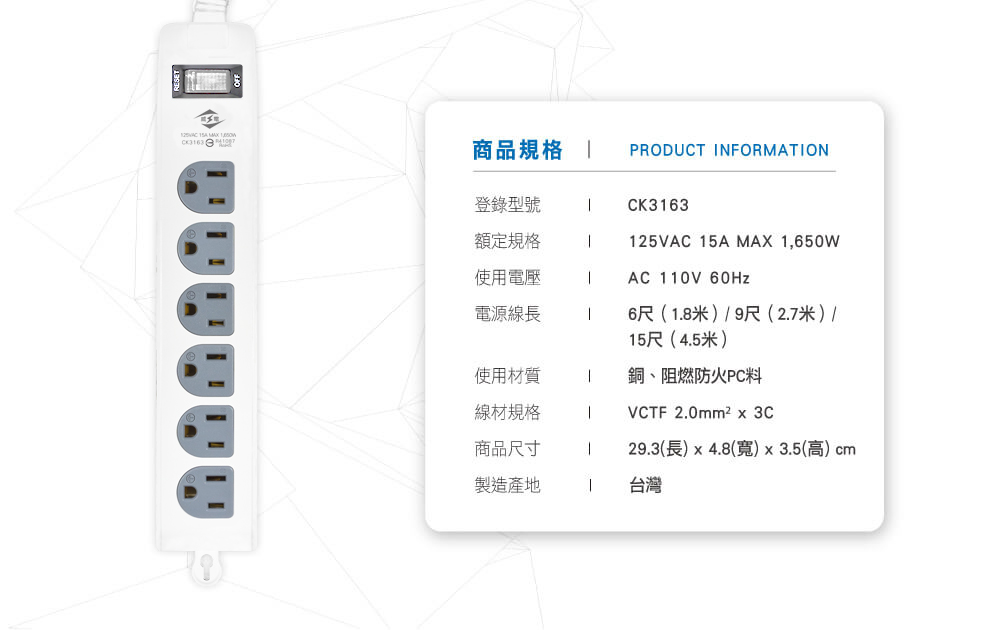 ‧ 過載自動斷電 ‧ 阻燃防火PC料 ‧ 特殊獨立網...
