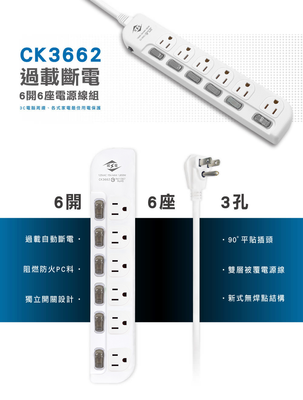 ‧ 過載自動斷電 ‧ 阻燃防火PC料 ‧ 90度平貼插...