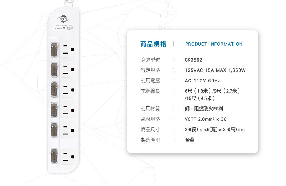 ‧ 防雷擊‧突波吸收 ‧ 過載自動斷電 ‧ 阻燃...