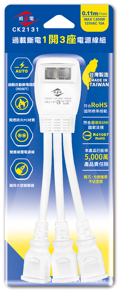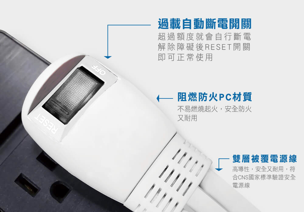 ‧ 過載自動斷電 ‧ 阻燃防火PC料 ‧ 雙層被覆電...