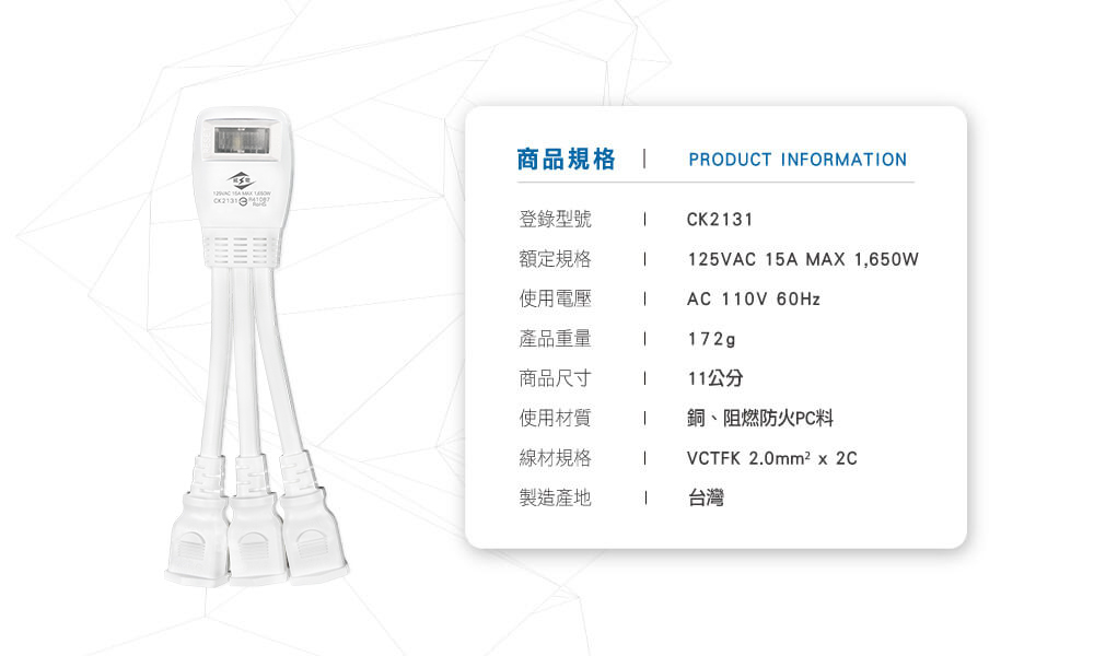 ‧ 阻燃防火PC料 ‧ 雙層被覆電源線 ‧ 過載自動...