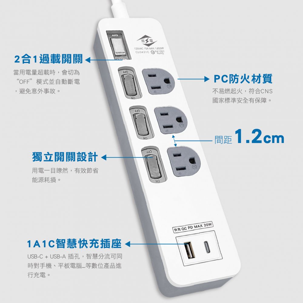 20W QC PD 智慧快充4開3座電源線組 - CU3431C
